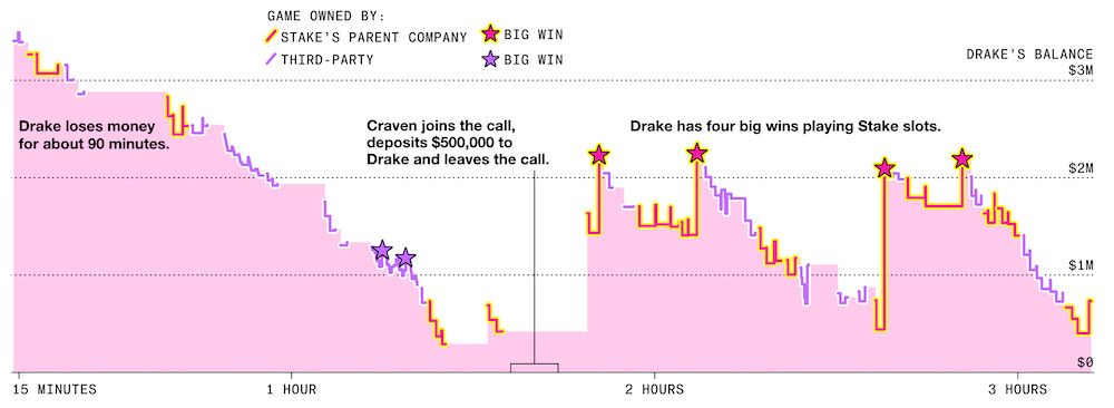 Quand la chance vous sourit : Drake, la superstar du rap et ambassadeur de marque de Stake, est au plus bas. Son bankroll initial de $3.5m en bitcoins est de seulement $422K, mais il passe à la Speed Roulette sur les conseils du cofondateur de Stake, Ed Craven, et sa chance tourne. Le changement de fortune est rapide : après quelques tours, il empoche $800K, puis, après avoir essayé une autre machine à sous appelée Puffer Stacks, il empoche encore $800K et finit avec un solde de $2.2m.